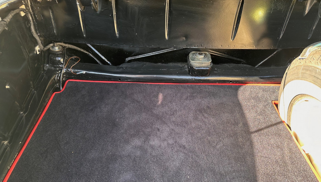 Autre gros dossier, la sellerie qui a été entièrement refaite, l’intérieur cuir rouge est magnifique, les moquettes sont neuves et enfin, la voiture est parée d’une très belle capote rouge en Alpaga, le tout fait en 2021. Les instruments de bords sont complets et fonctionnels, de très belles factures. Toutes les manivelles et poignées de porte sont impeccables.