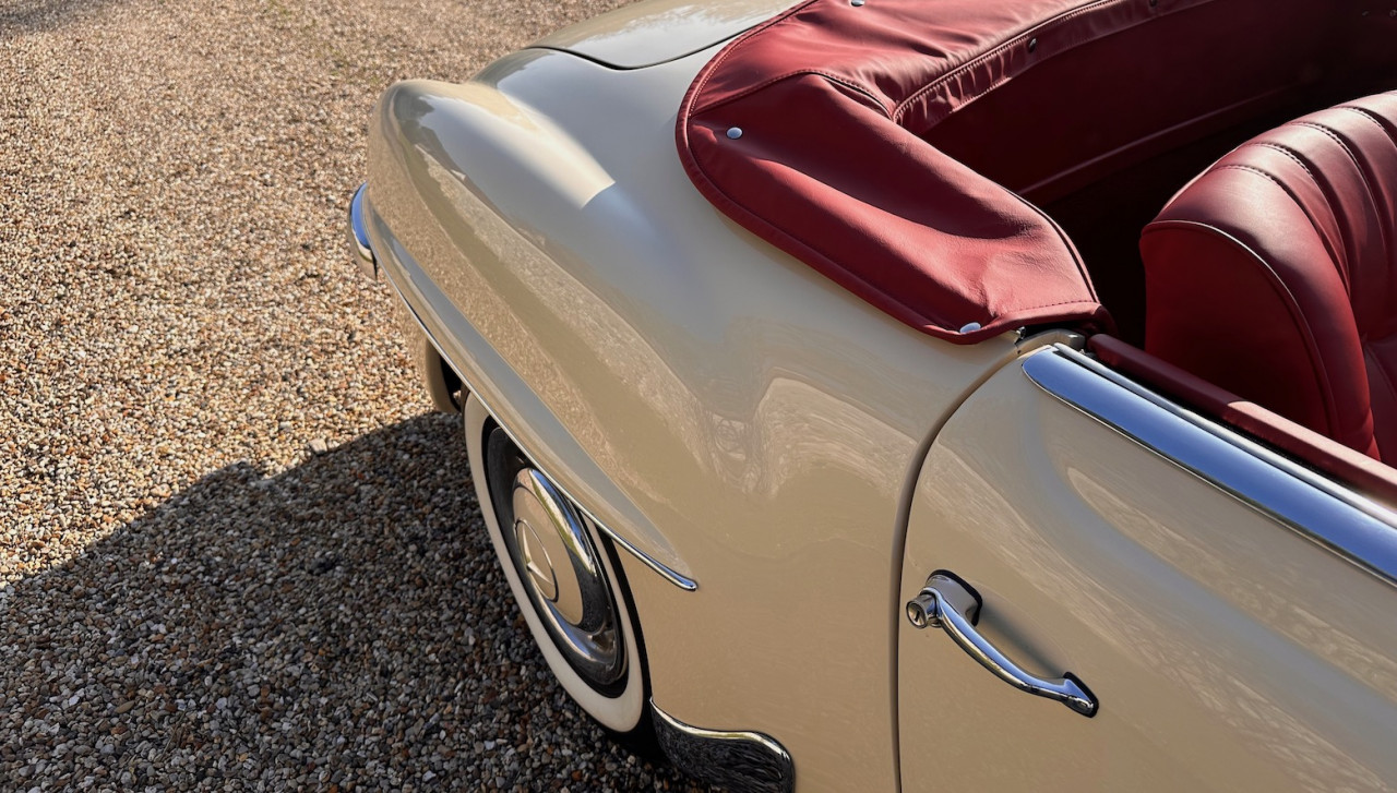 La carrosserie est un poste très lourd financièrement et qui représente près de 50 000 € de frais sur cette voiture avec un dossier photo qui témoigne de la profondeur de la restauration. C’est simple, la 190 a été entièrement démontée et changement des planchers, planchers de coffre, traverse avant, passages de roues AV et AR, les ailes AR, jusqu’au longerons AR qui ont été remplacés. Un travail intense de carrossier qui a été effectué en 2021 avec une facture détaillée à l’appui.
