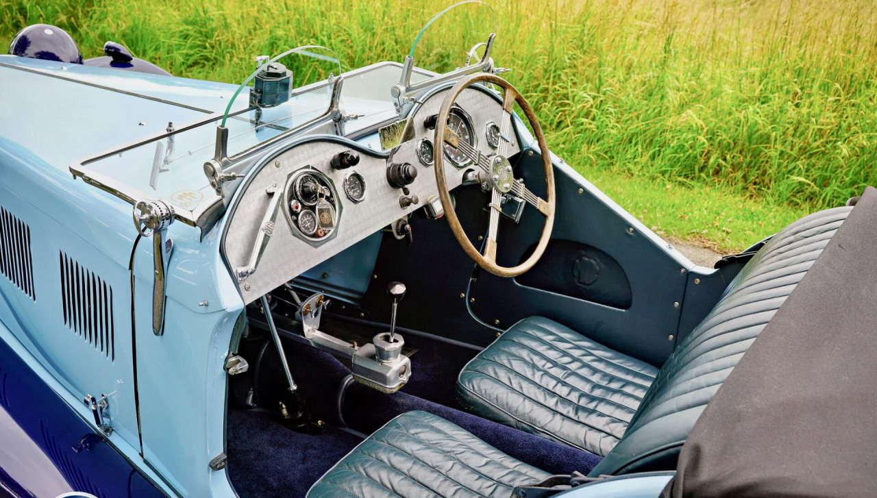 Réalisée dans la combinaison d'usine bicolore d'origine Oxford bleu avec Cambridge bleu, combinée avec un intérieur en cuir bleu et un tapis bleu.