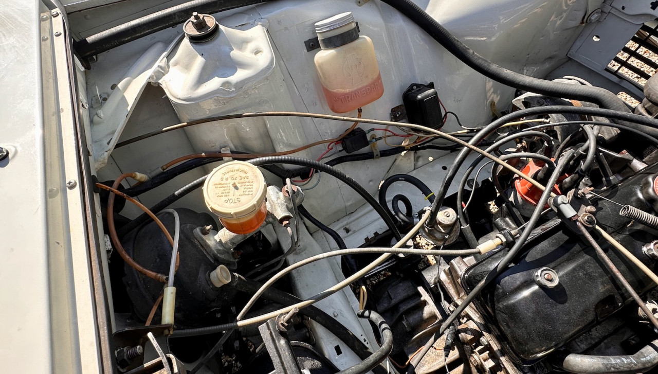 Le moteur est en excellente santé et démarre au quart de tour. Le compartiment moteur a fait l’objet des plus grands soins, les périphériques sont tous récents et opérationnels. La voiture dispose d’une boîte de vitesse à 4 rapports, le levier est au plancher. Le passage des rapports se fait sans contrainte. Les rotules de sélecteur, le joint spi de queue de boite, le sélecteur lui -même ; tout a été changé ainsi que le soufflet.