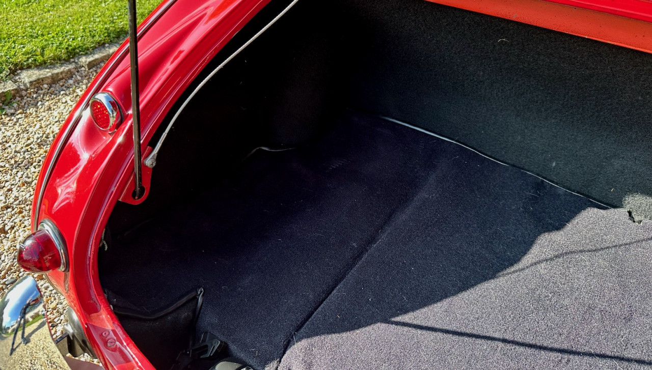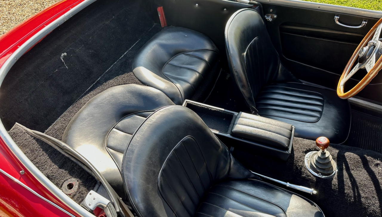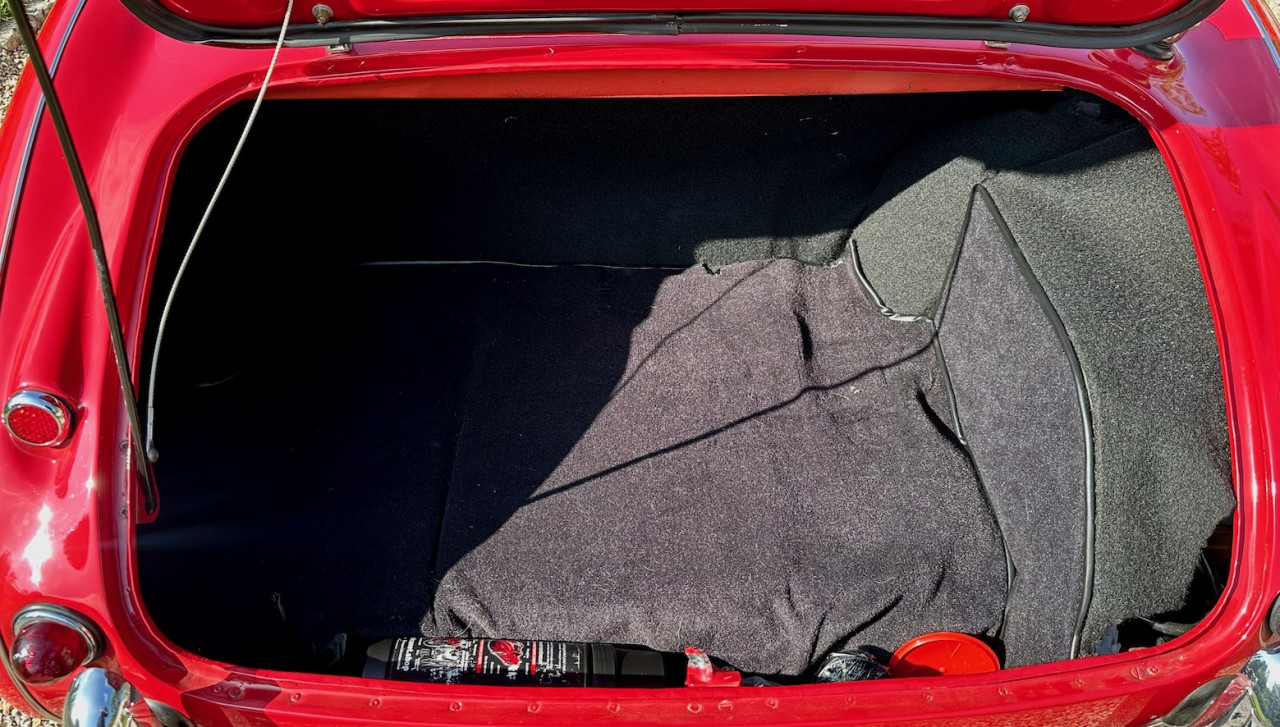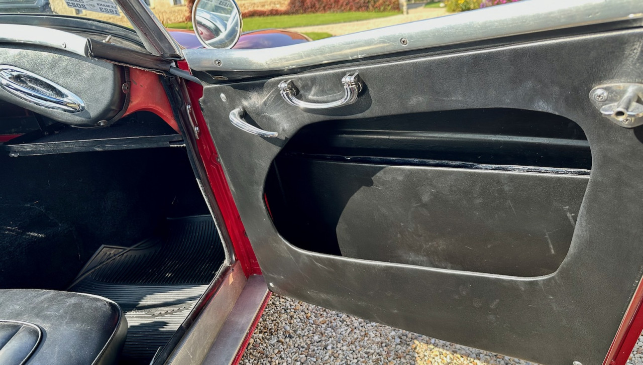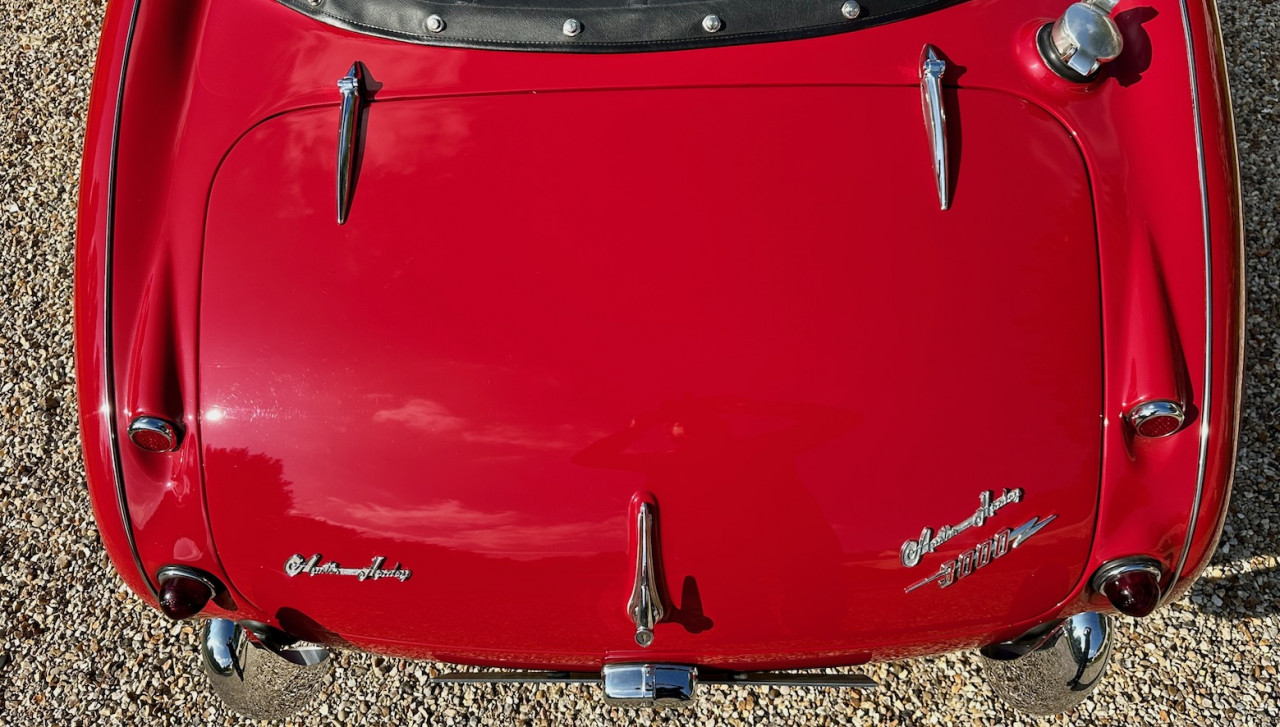 Au niveau carrosserie, la voiture est saine et la peinture est très belle, certainement faite aux US.. Les dessous sont sains, la peinture de couleur rouge Colorado est belle, pas de besoin de la refaire. Les alignements de porte sont parfaits, tout est en ligne, élément important à prendre en compte lors de l’achat d’une Austin Healey.