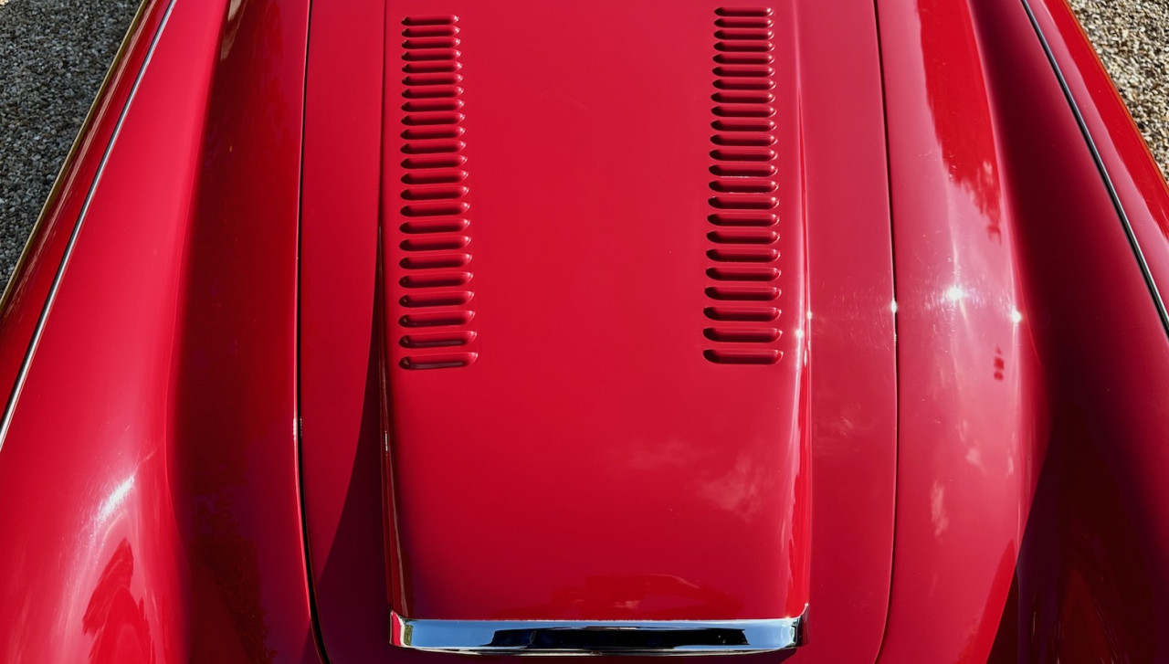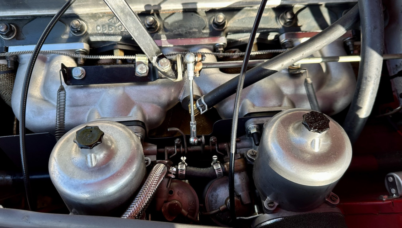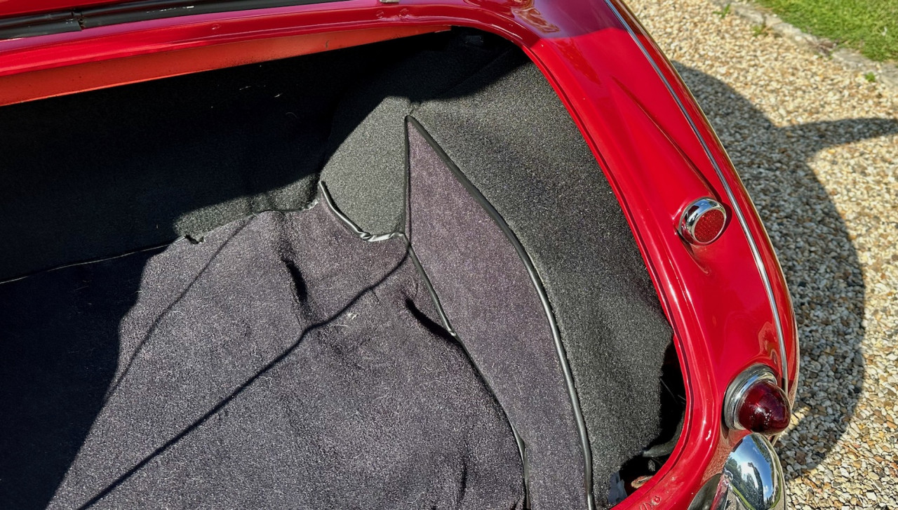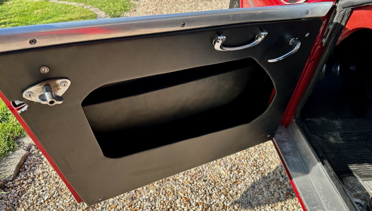 Au niveau carrosserie, la voiture est saine et la peinture est très belle, certainement faite aux US.. Les dessous sont sains, la peinture de couleur rouge Colorado est belle, pas de besoin de la refaire. Les alignements de porte sont parfaits, tout est en ligne, élément important à prendre en compte lors de l’achat d’une Austin Healey.