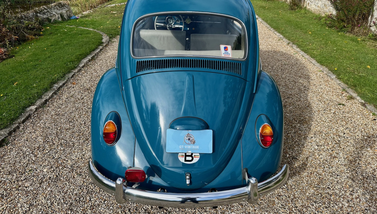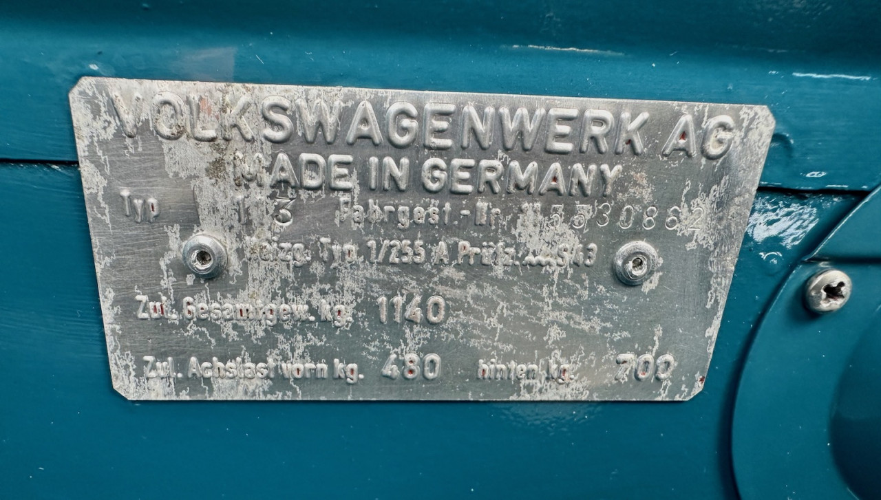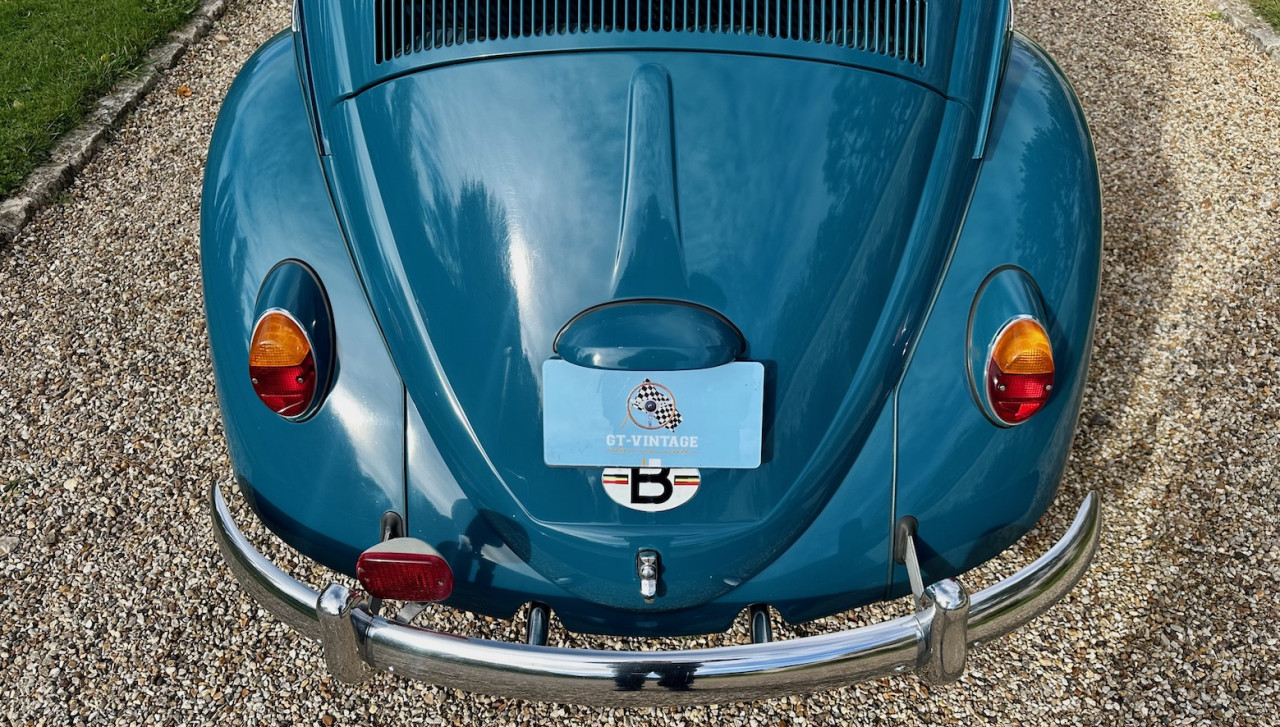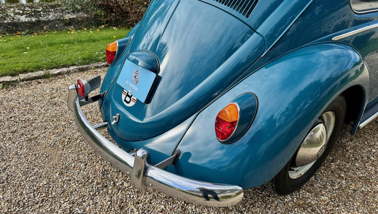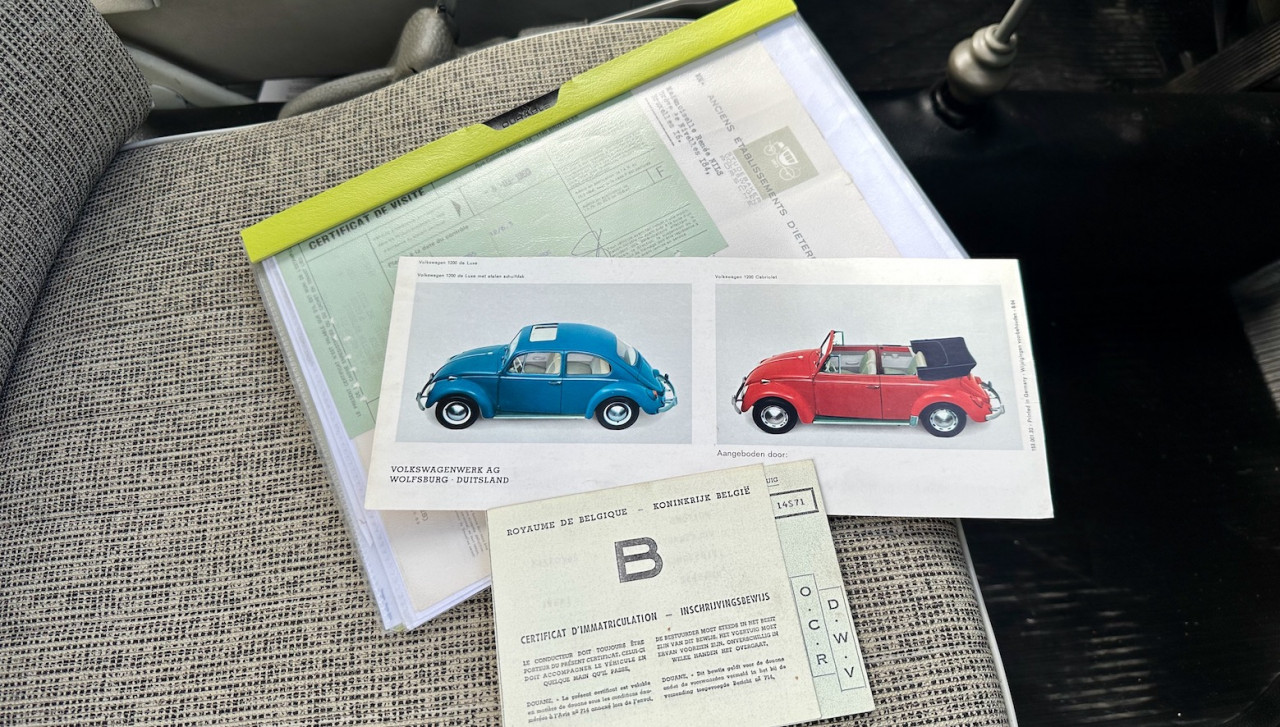 Elle est encore avec son immatriculation Belge, elle a été commandée neuve à la concession VW d’Ieteren à Bruxelles le 26 Mars 1965 , nous disposons de la facture d’achat, de la carte grise d’origine.