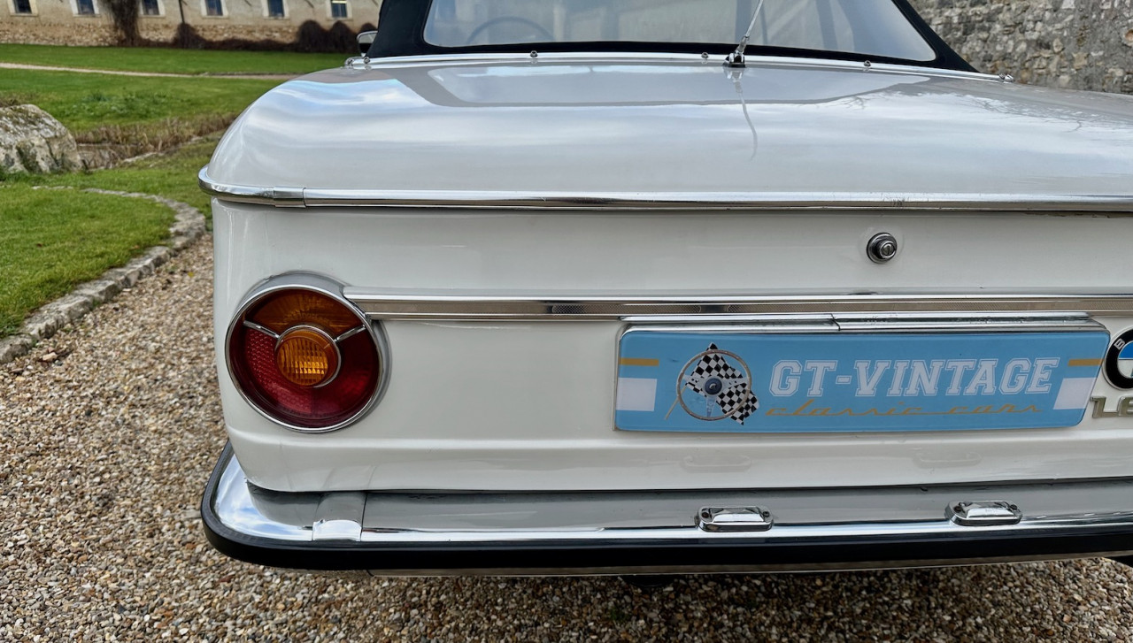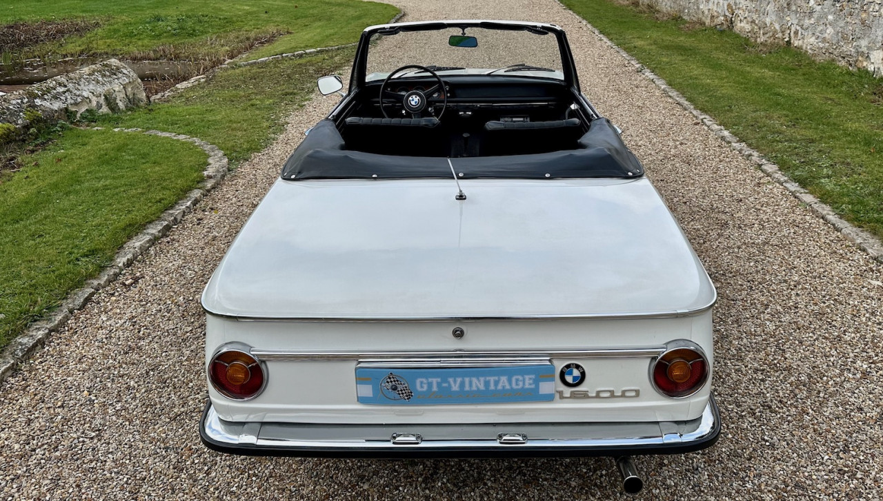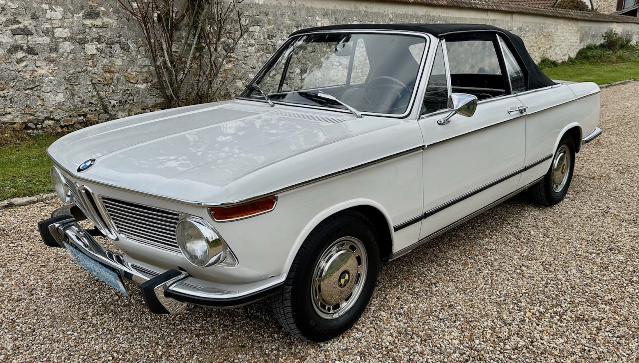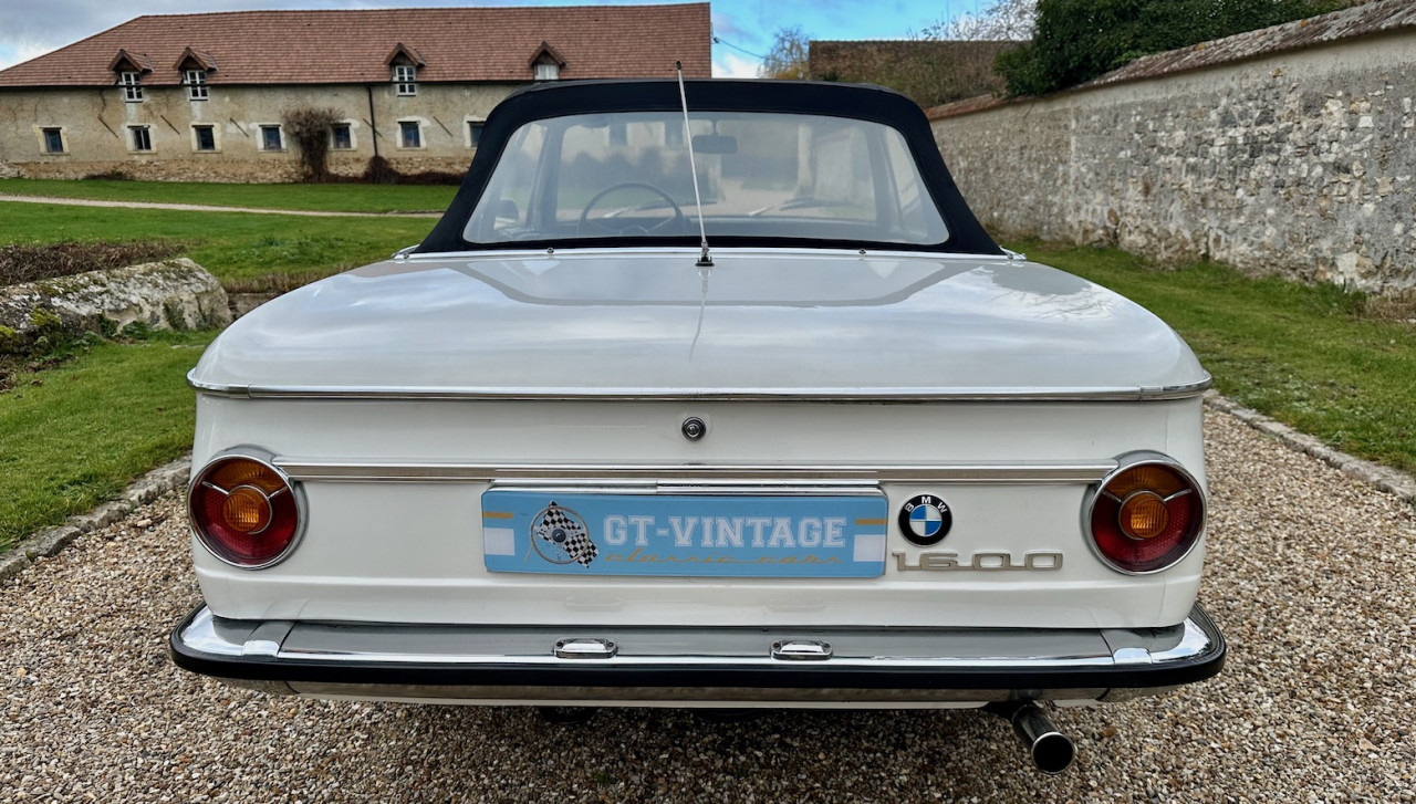 Description : Nous vous proposons à la vente un rare exemplaire de BMW 1600 cabriolet qui est sortie de fabrication le 17/10/1969 en Allemagne dans les usines BAUR et sera commercialisée en France en septembre 1970, il est en carte grise française de collection, sous le numéro de série 1558058, dans sa livrée d’origine blanc Chamonix, intérieur noir.