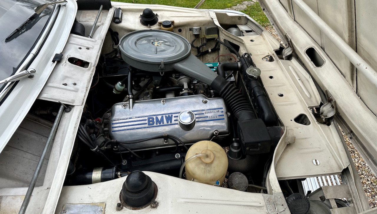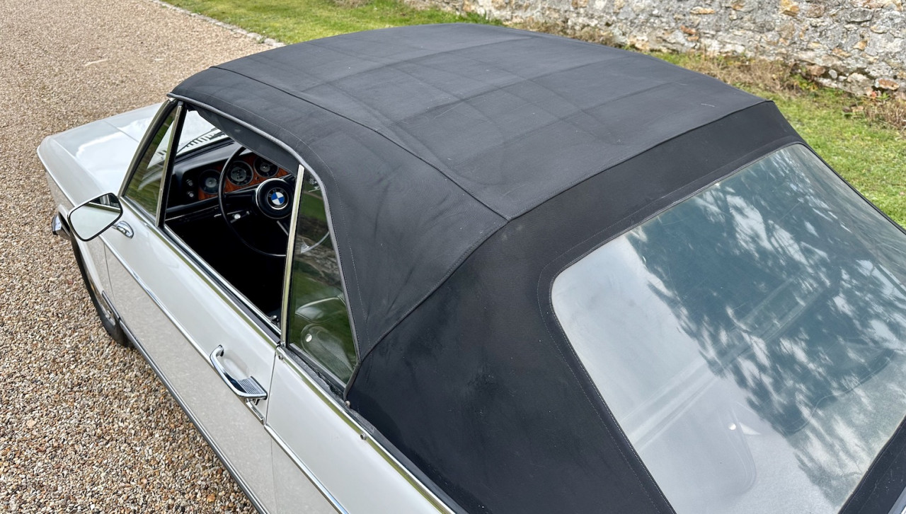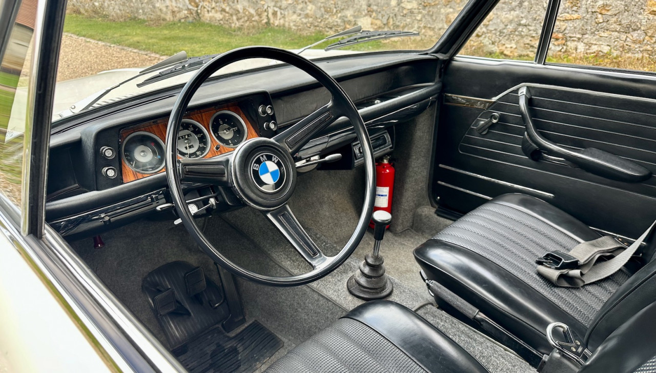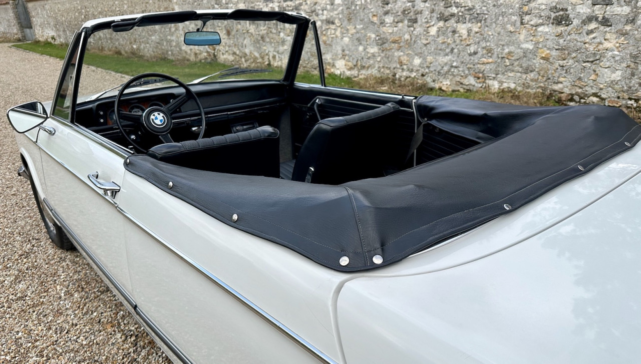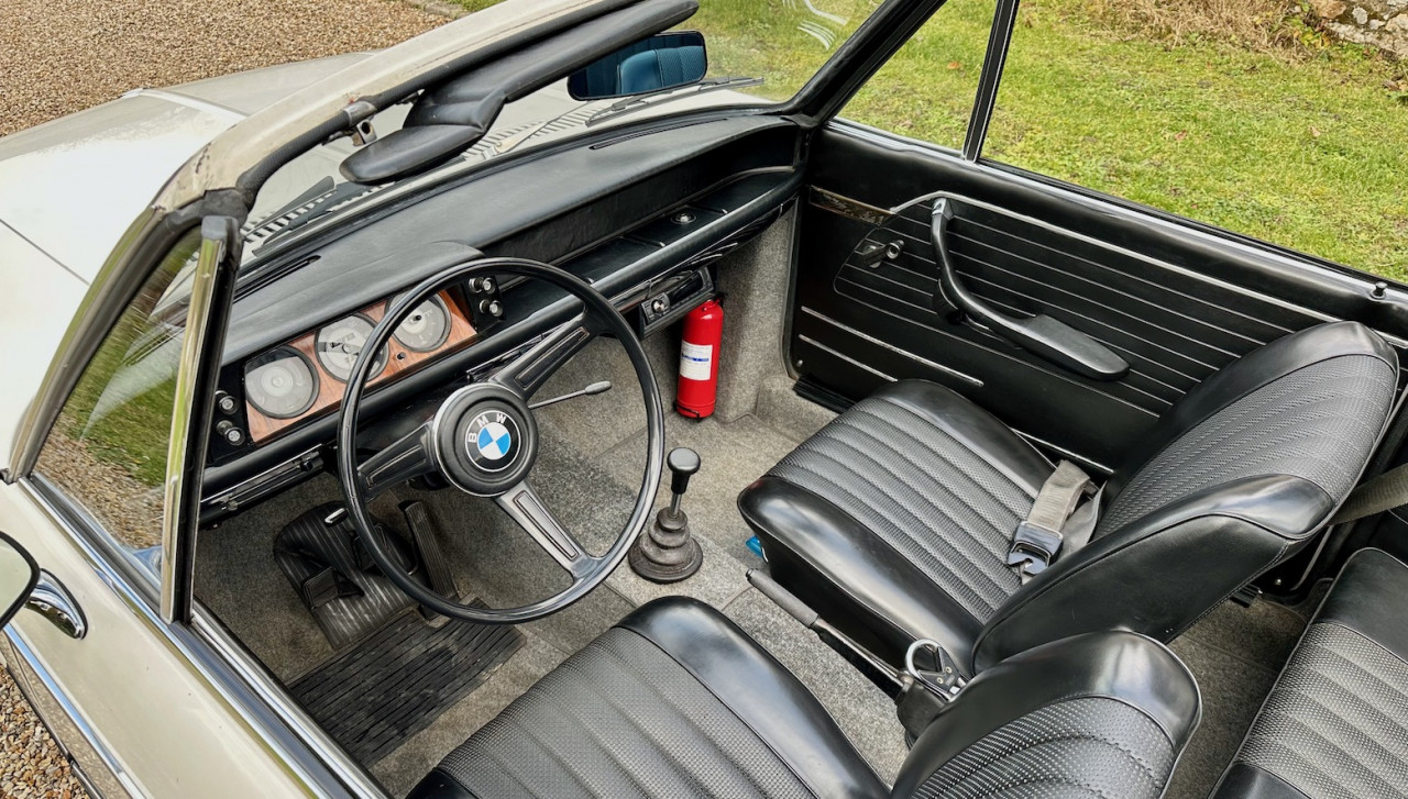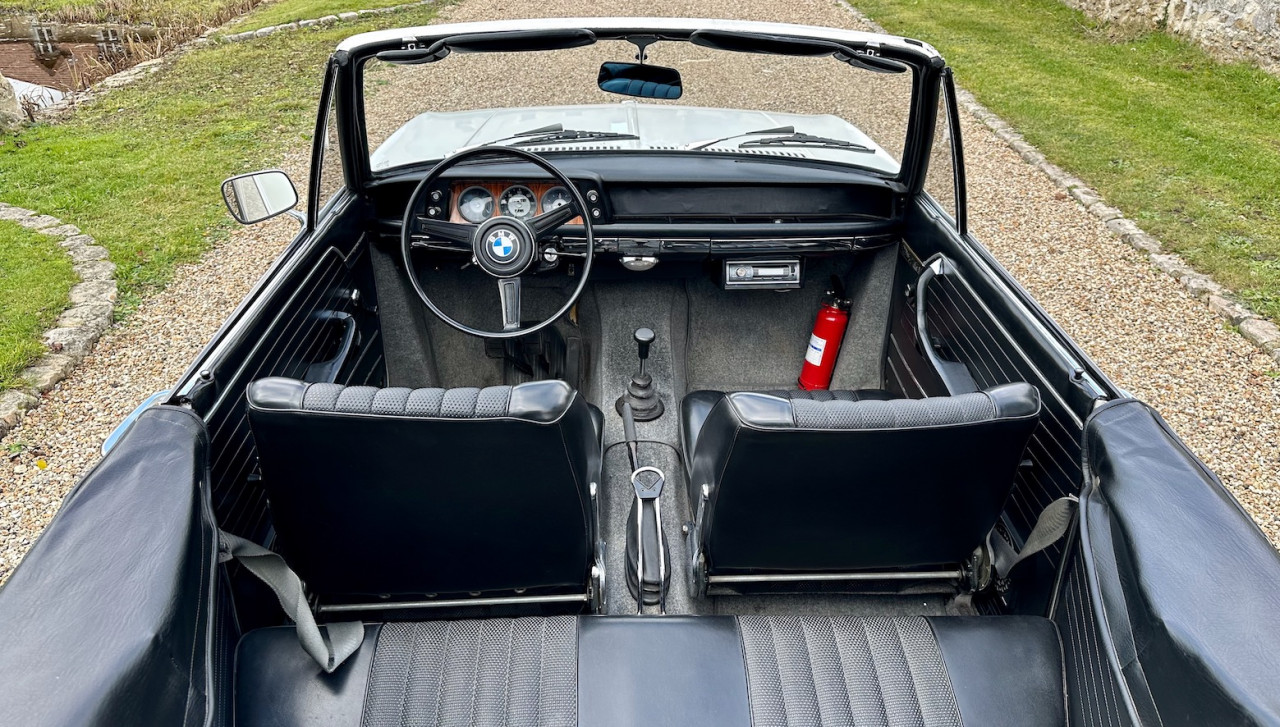 L’intérieur est en parfait état, pas de déchirures sur les sièges, qui sont confortables, le tableau de bord est conforme à l’origine, sans craquements et très vintage. La moquette est propre, les panneaux de porte complet. L'intérieur témoigne de la transition entre les années 1960 et 1970 : la sellerie est très propre. Ce cabriolet offre quatre places spacieuses, un confort digne de la marque bavaroise. Devant le grand volant en bakélite se trouvent trois compteurs ronds au style minimaliste, qui vont à l'essentiel avec une touche sportive. La console centrale se termine au niveau du tunnel de transmission, où se trouvent l'autoradio non d’origine et la boîte de vitesses manuelle à quatre rapports.