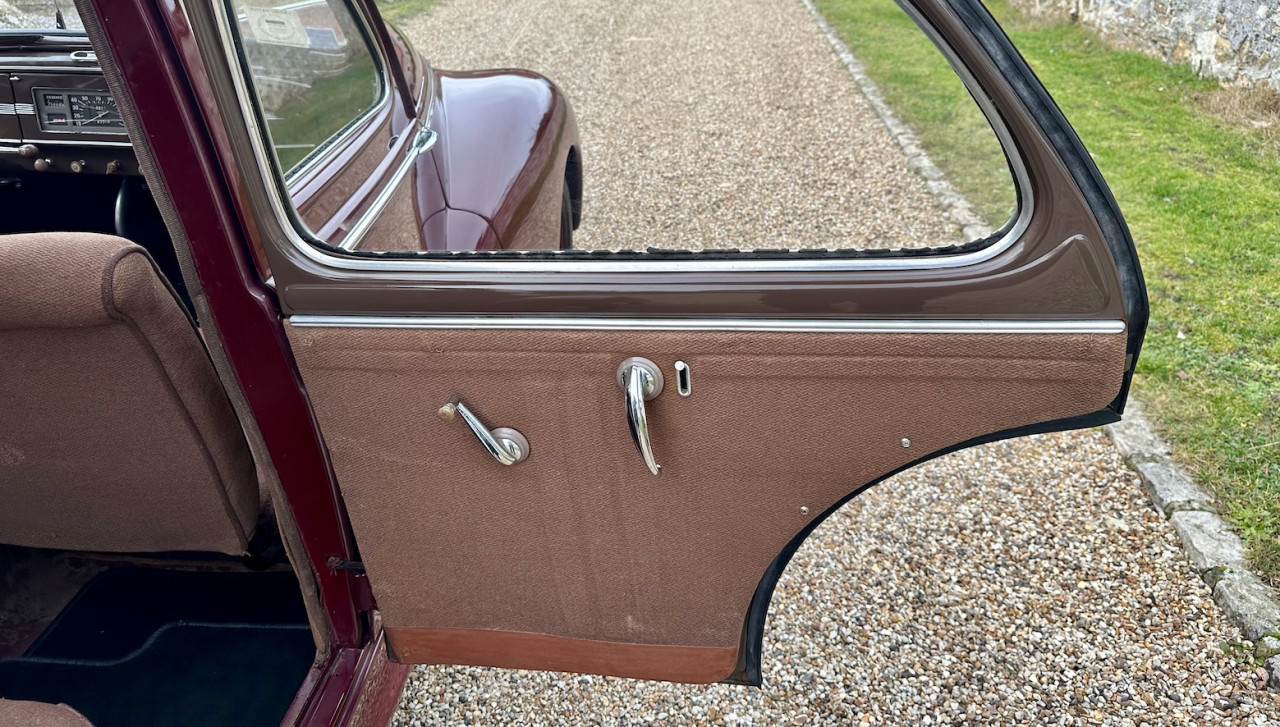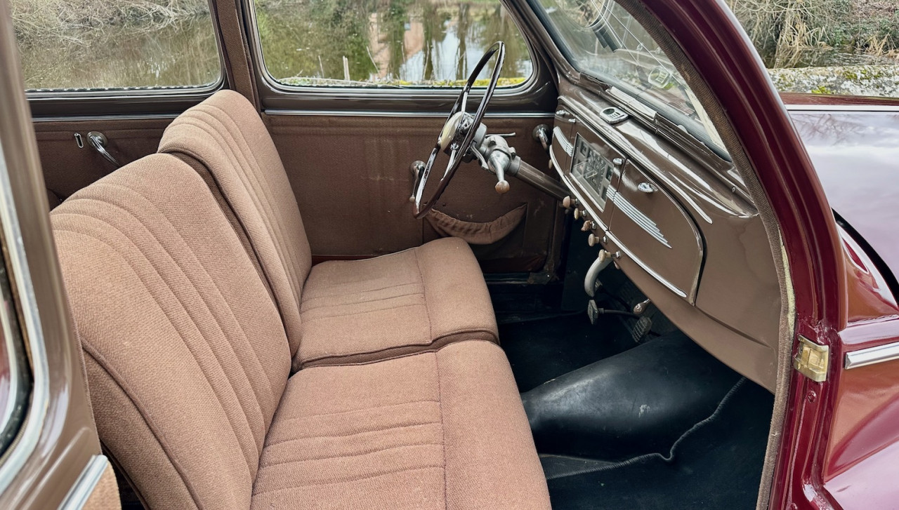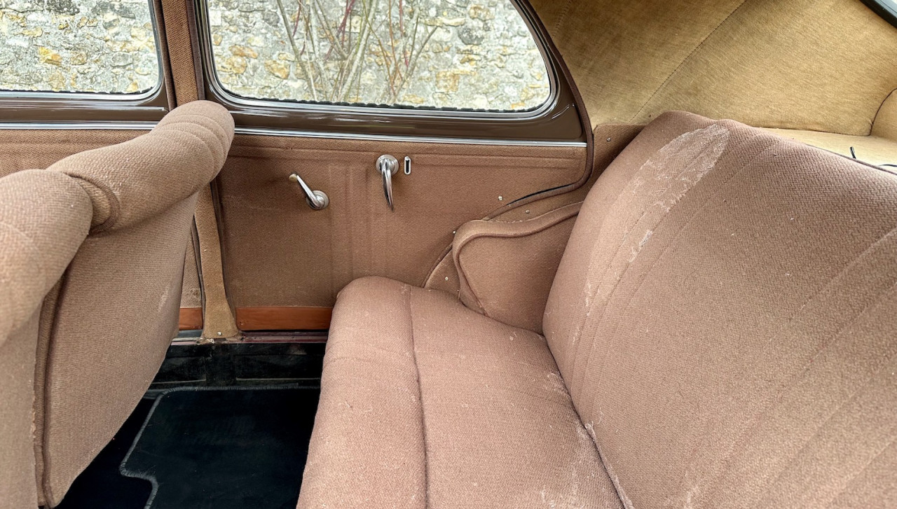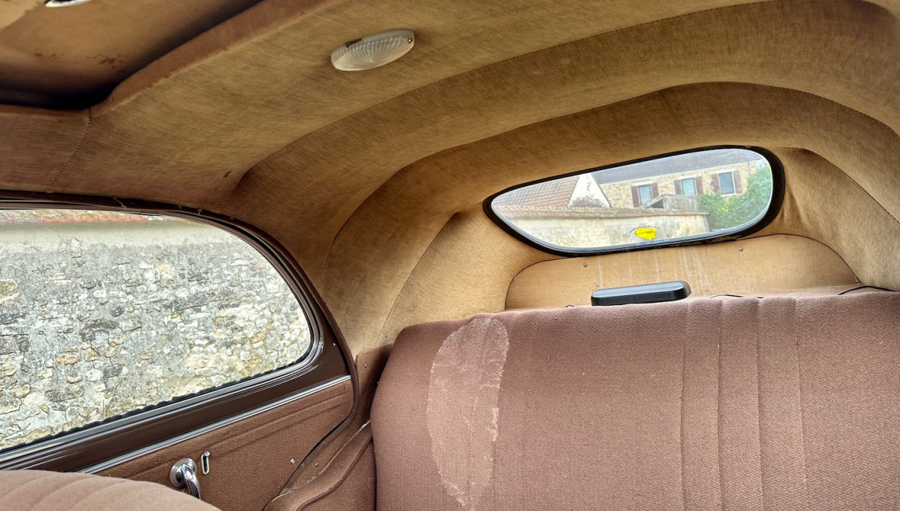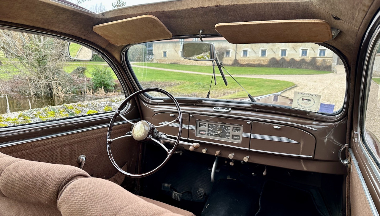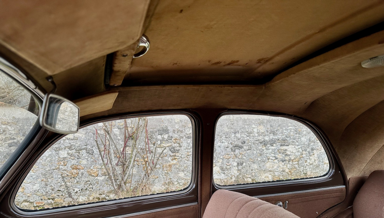 L’intérieur est celui d’origine (sièges, ciel de toit, panneaux de porte). Les sièges étaient recouverts de housse d’époque, le tissu est présentable et sera à l’appréciation du nouvel acquéreur.
