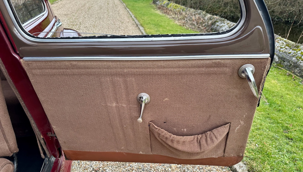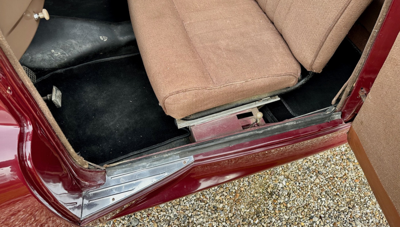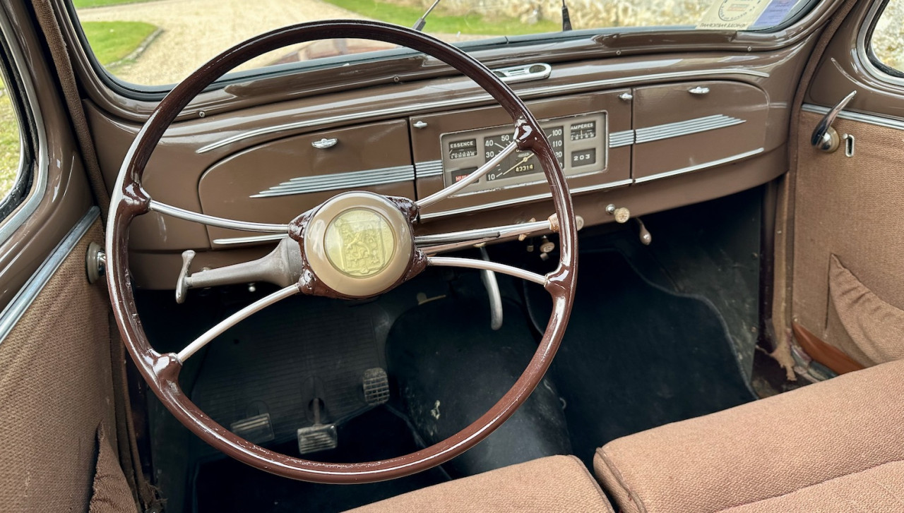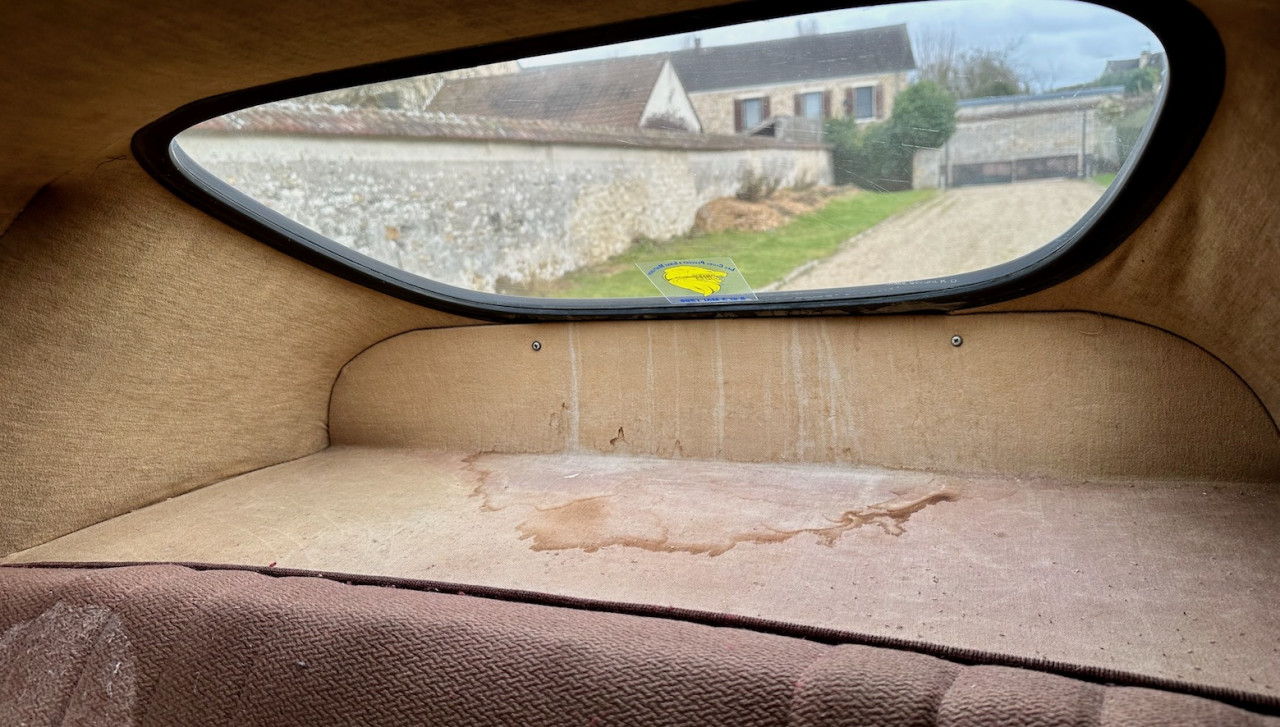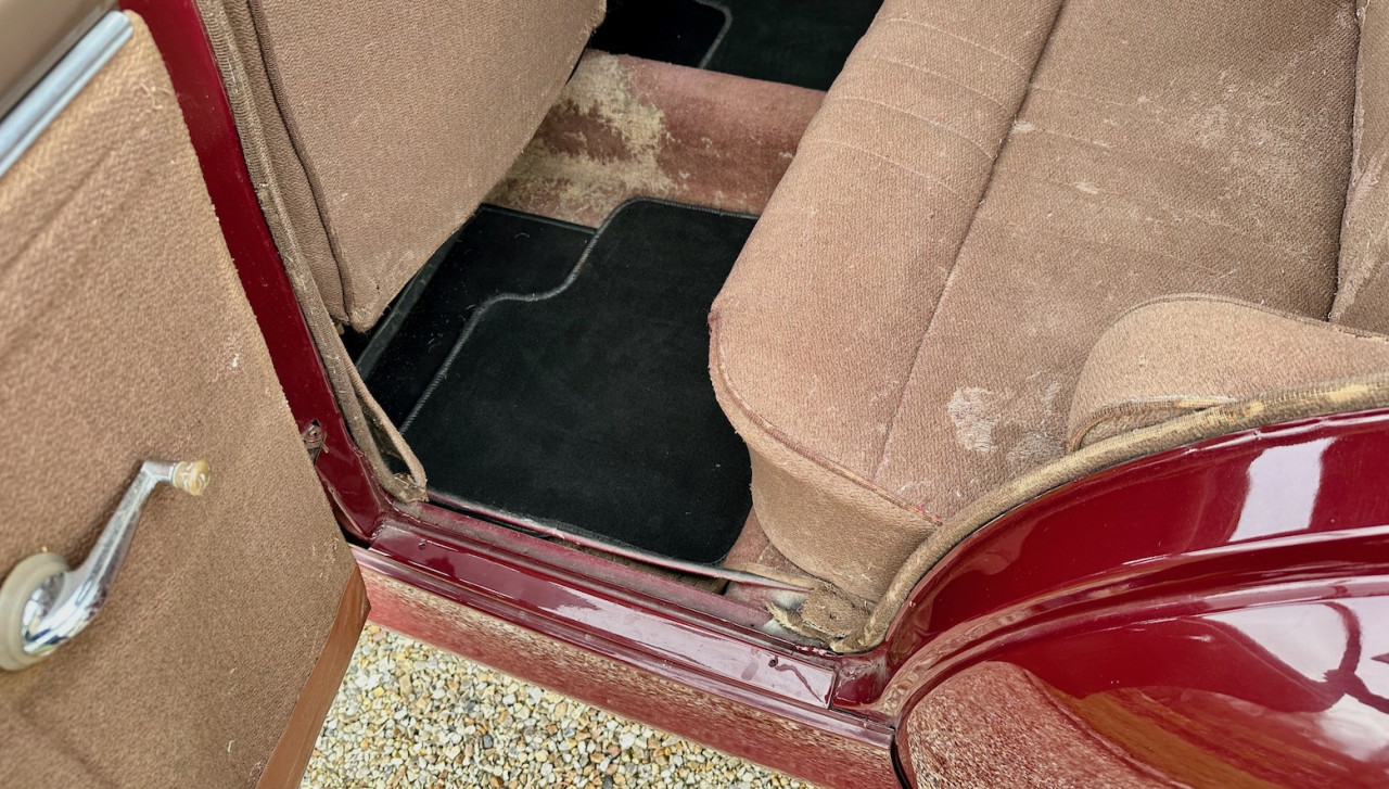 L’intérieur est celui d’origine (sièges, ciel de toit, panneaux de porte). Les sièges étaient recouverts de housse d’époque, le tissu est présentable et sera à l’appréciation du nouvel acquéreur.