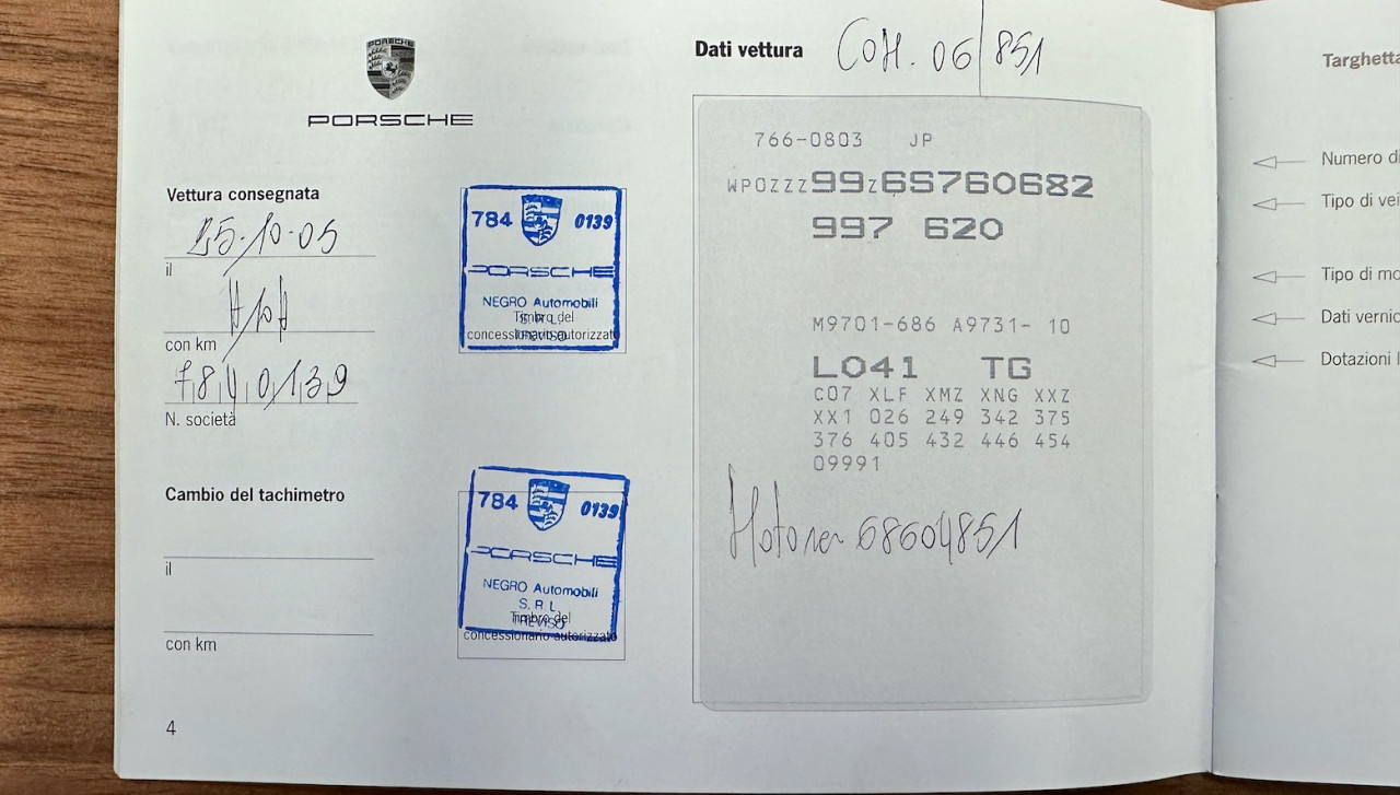 Elle date du 25/10/2005 et fut livrée neuve à la concession PORSCHE NEGRO Automobili dans la province de Trévise.