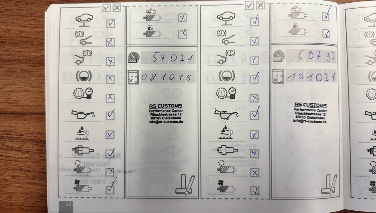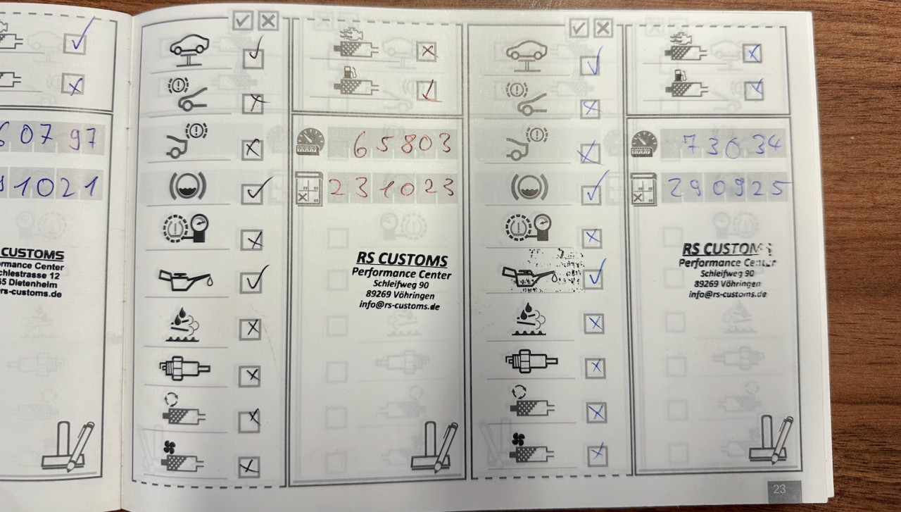Les instructions d'origine, le livret d'entretien et le manuel en français sont également présents et les services d'entretien suivants sont estampillés dans le livret d'entretien :